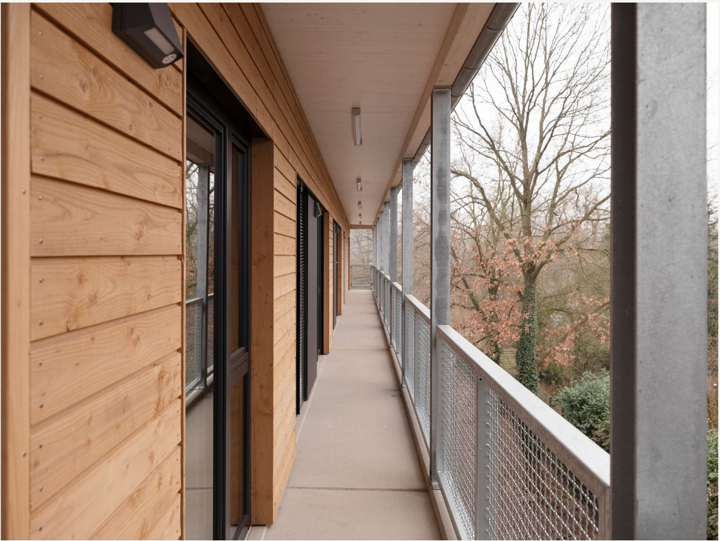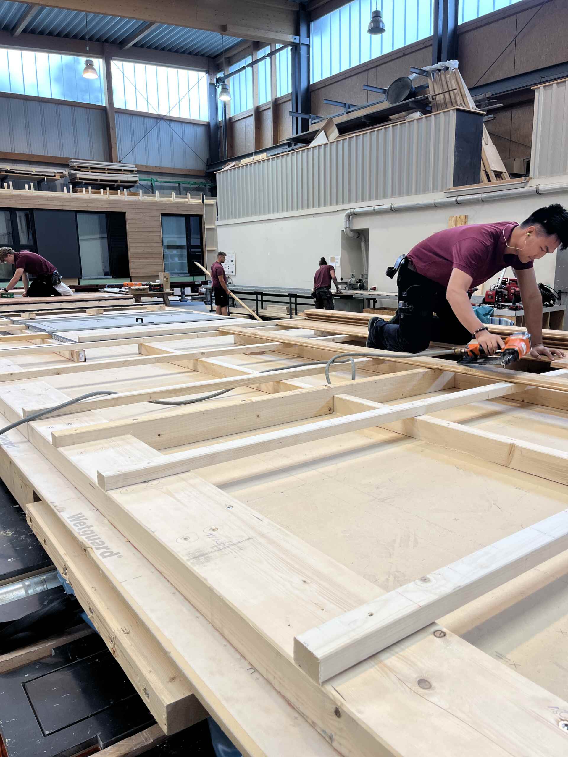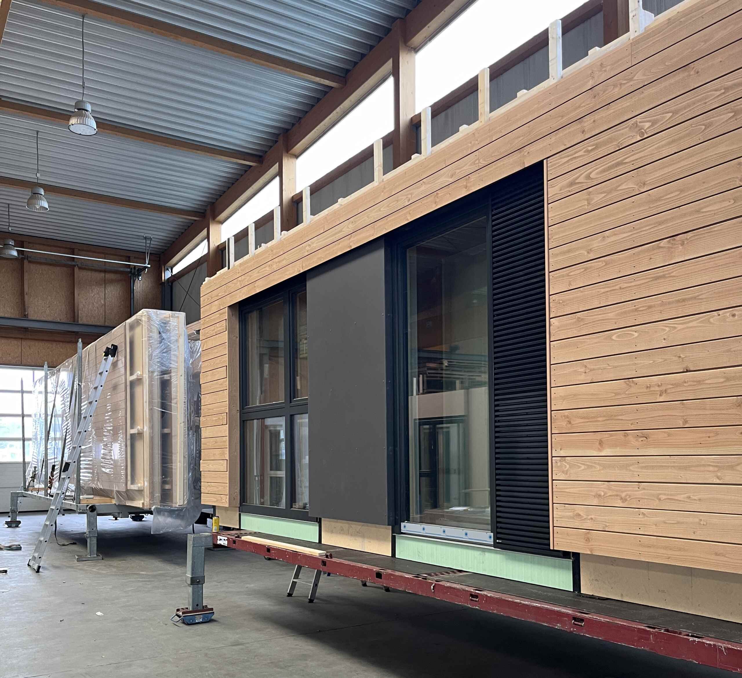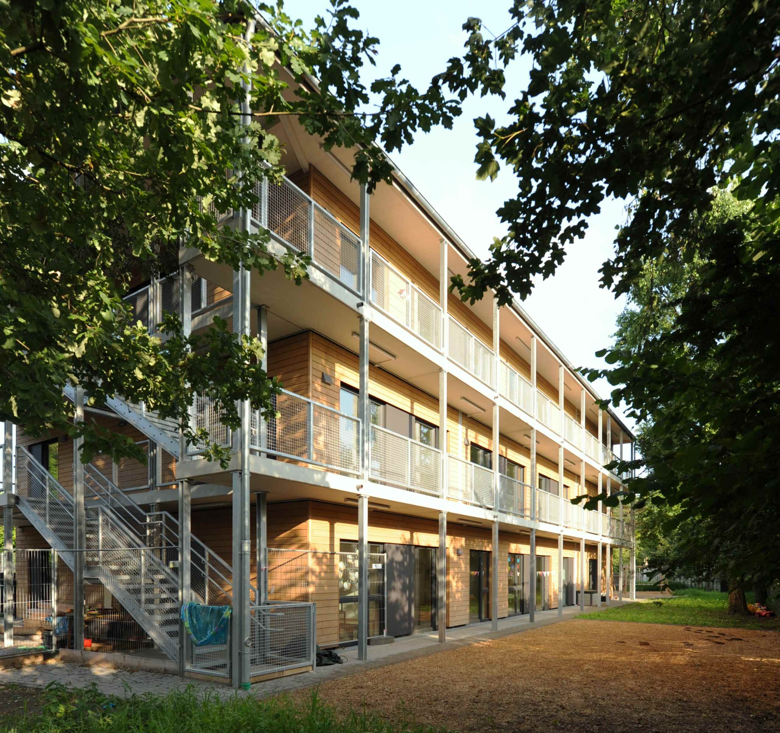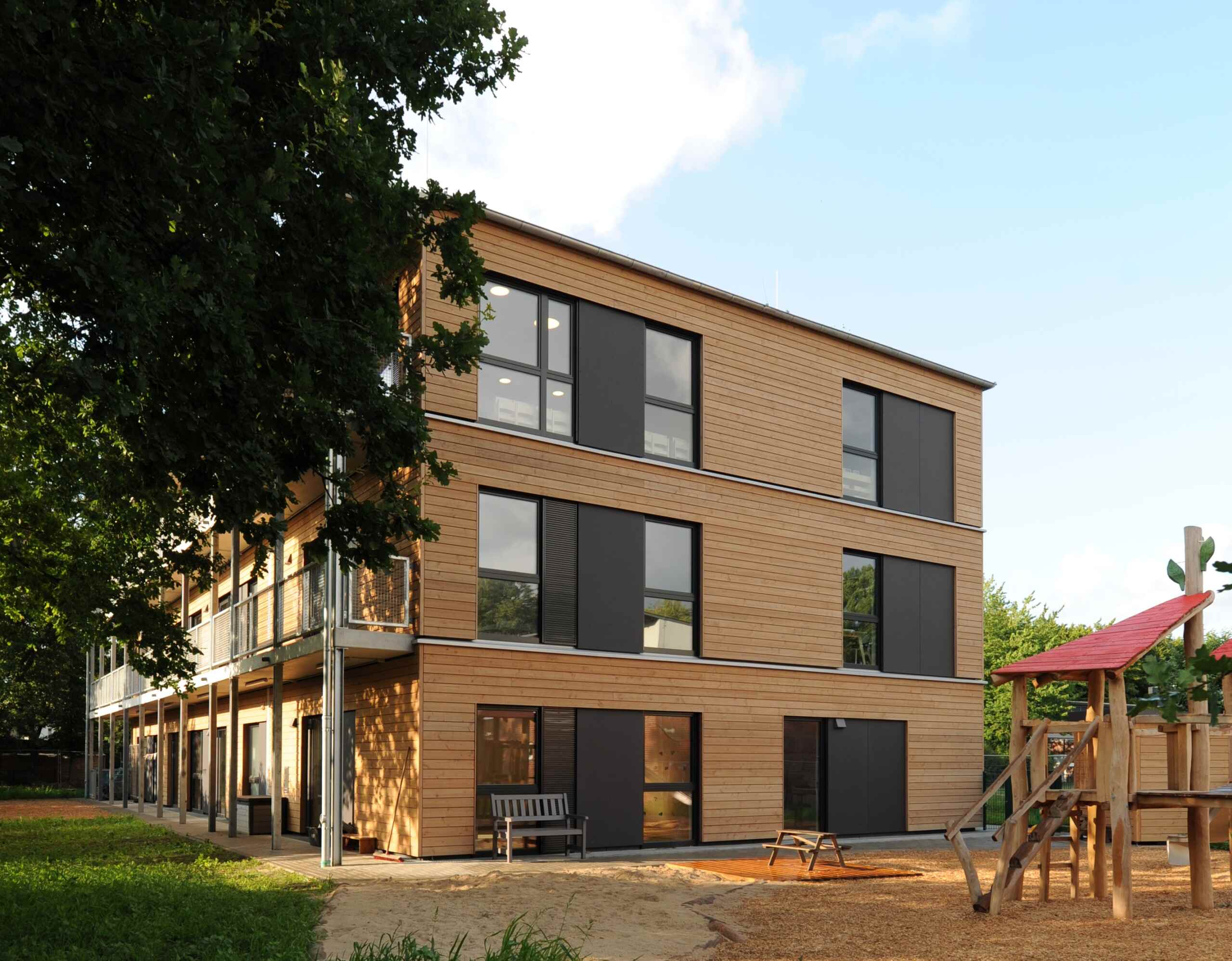 Das Gebäude wurde in Holztafelbau- und Holzmassivbauweise realisiert. Durch den hohen Vorfertigungsgrad konnten die Bauelemente bereits werkseitig mit vormontierten Fenstern und Türen, vorgerüsteter Elektroinstallation Fassadenbekleidung und Sonnenschutz ausgestattet werden.