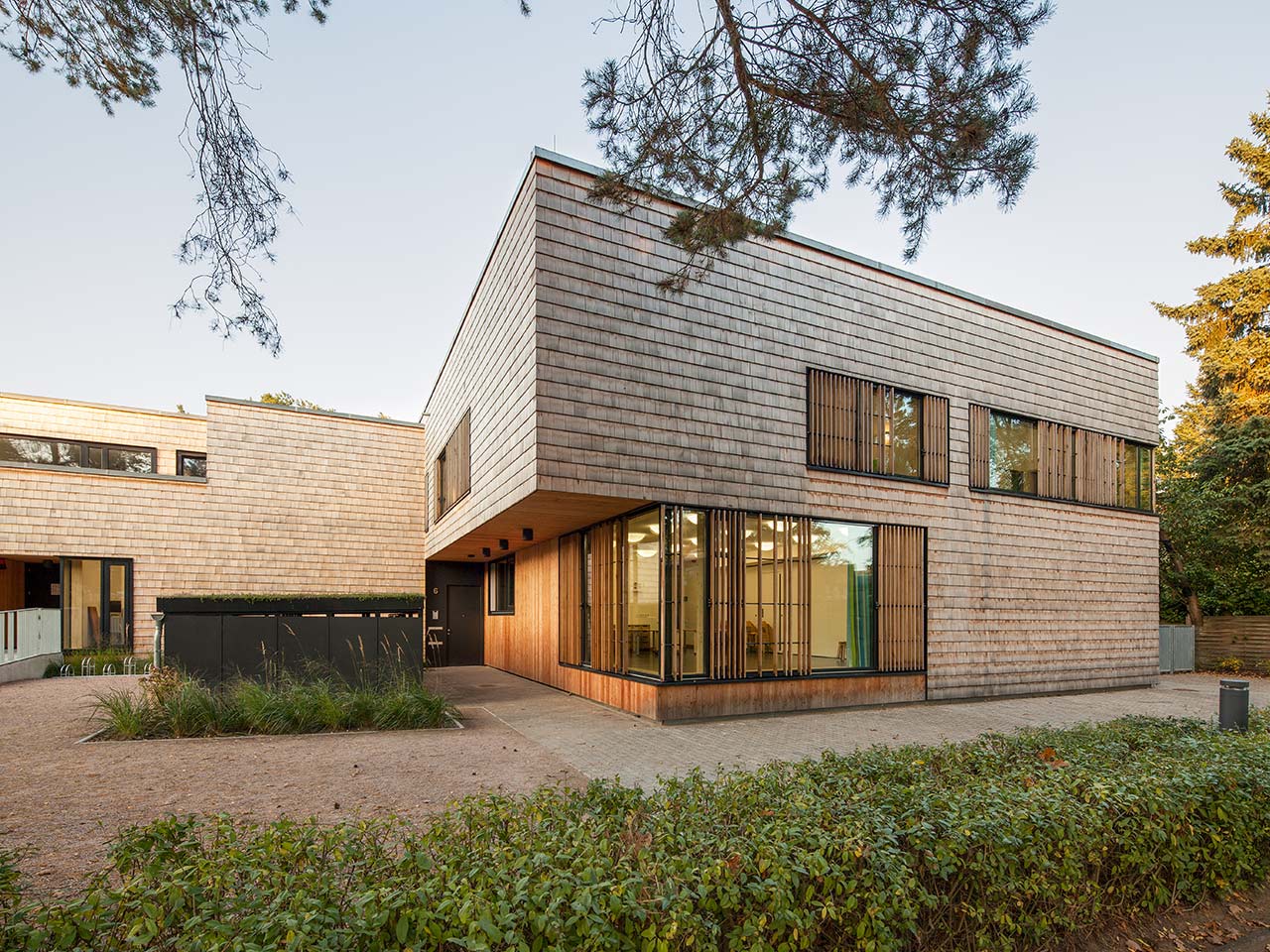 Ausführung: Holzbauarbeiten, Fassadenarbeiten, Pfosten-Riegelfassade, Fenster- und Türelemente