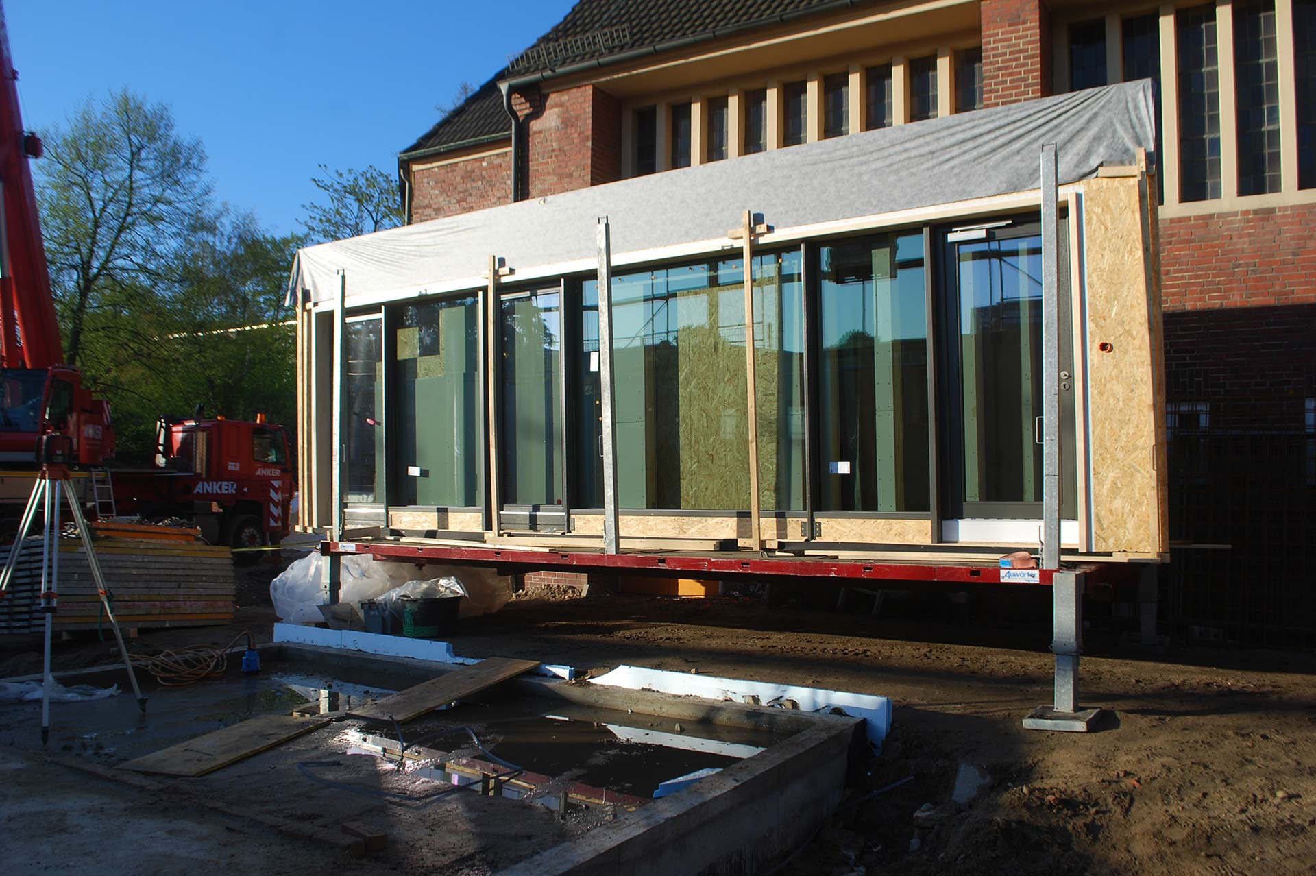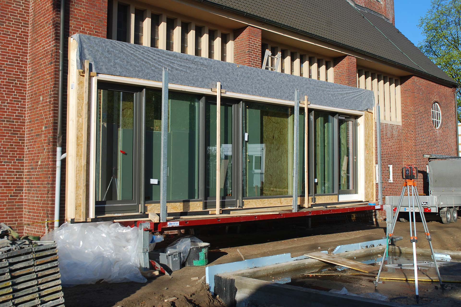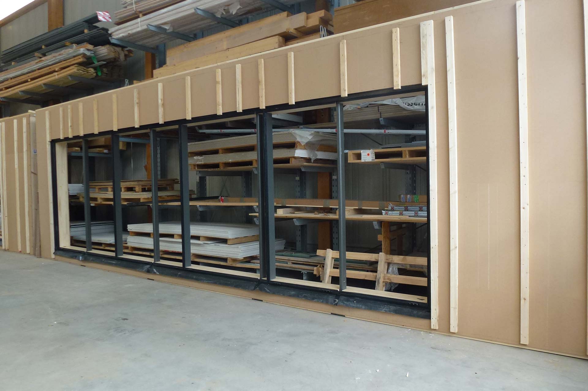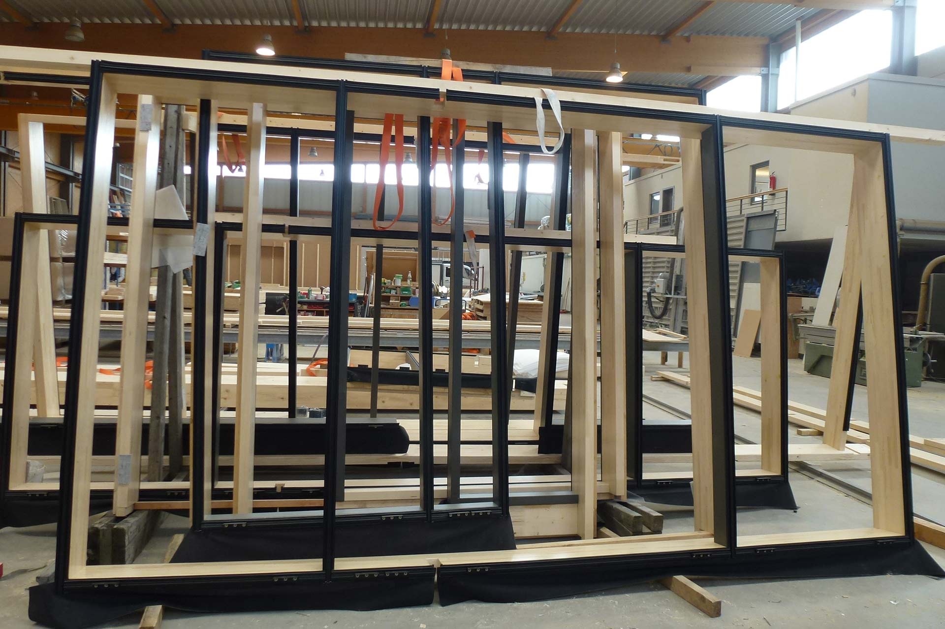 - Pfosten-Riegelfassade voll verglast mit Fenstern u. Türen im Werk vorgefertigt