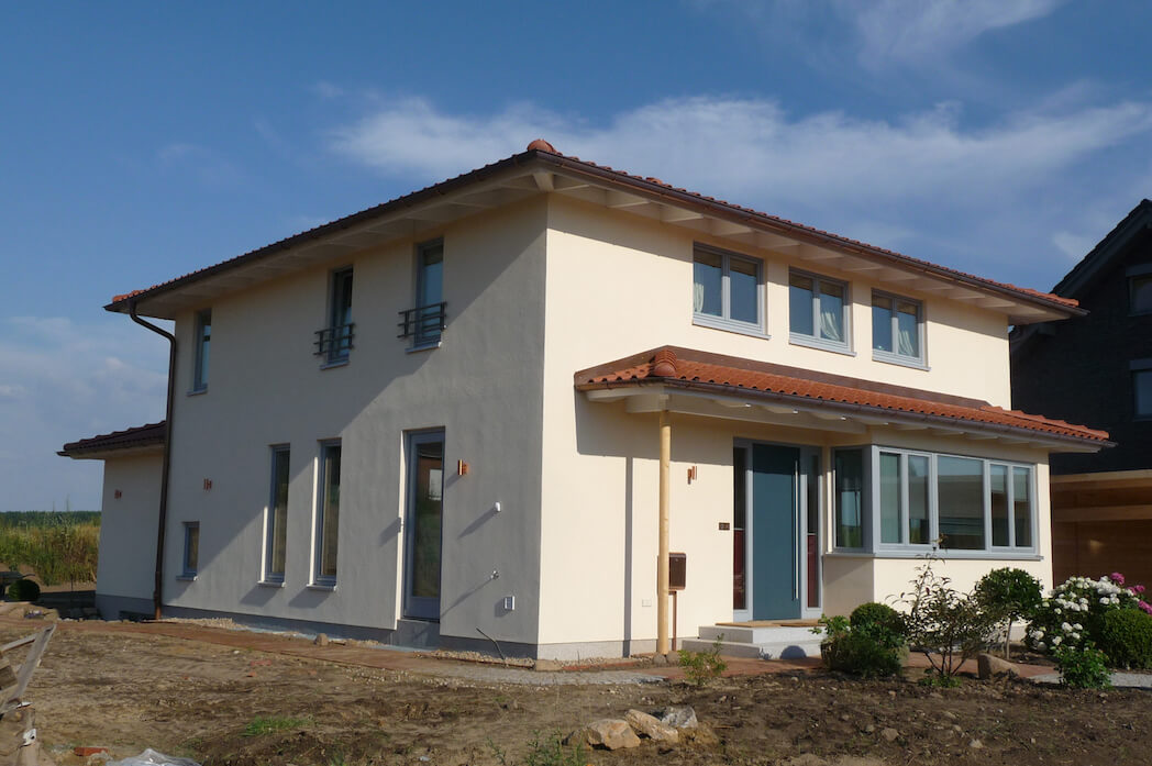 Ausführung: Holztafelbau, Fenster-/Türelemente, Putzfassade, Trockenbauarbeiten